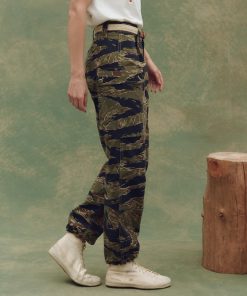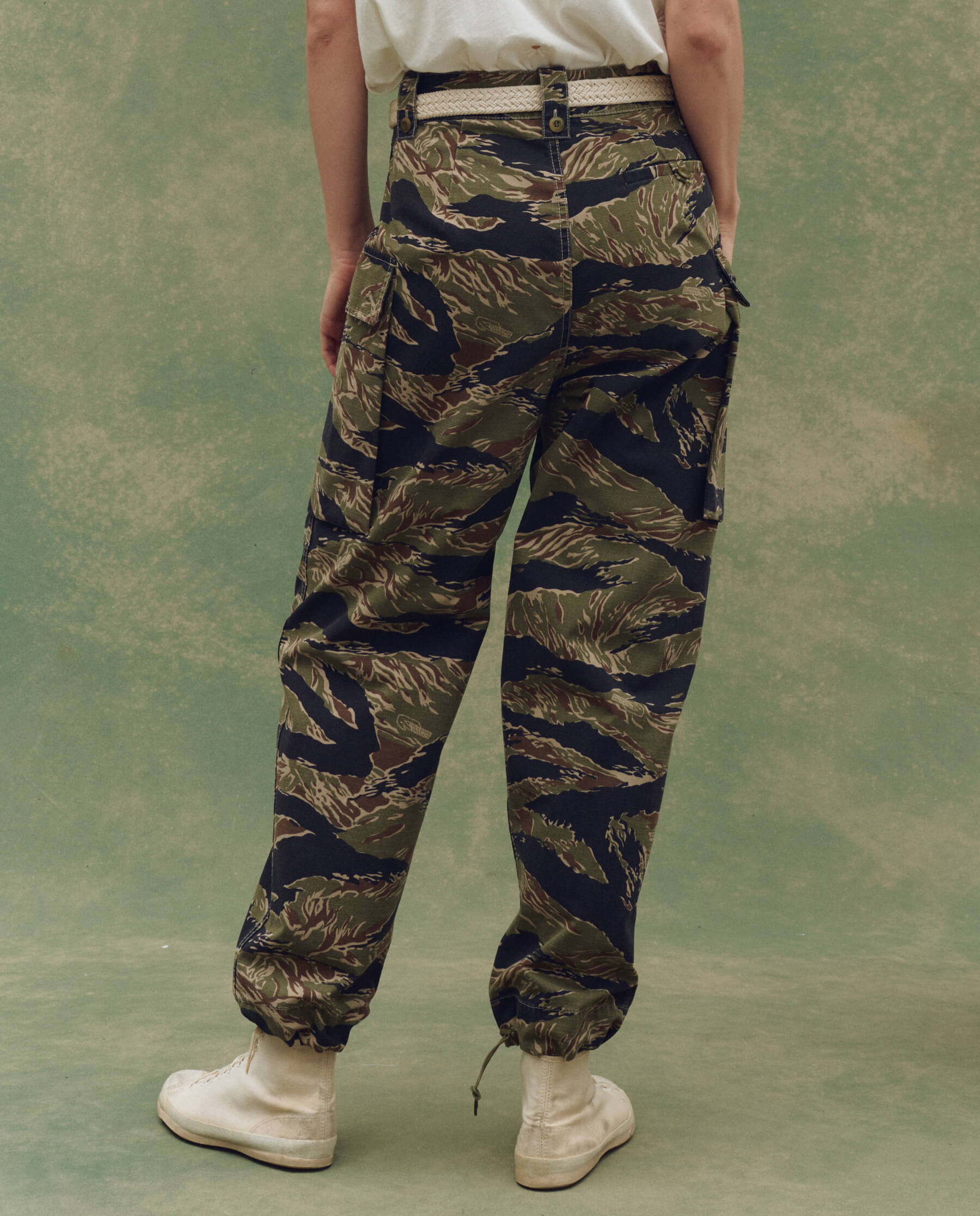 The Convoy Pant sits just below the waist with trouser-style pleats and a relaxed fit. Inspired by traditional military uniforms, it features cargo pockets, wide belt loops, and corozo buttons. Made from surplus military goods that we’ve repurposed from a Vietnam War era structured cotton camo, washed down to achieve the vintage hand-feel we crave. Complete with bungee cords at the ankle for an adjustable fit.
