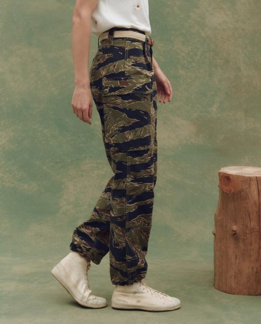 The Convoy Pant sits just below the waist with trouser-style pleats and a relaxed fit. Inspired by traditional military uniforms, it features cargo pockets, wide belt loops, and corozo buttons. Made from surplus military goods that we’ve repurposed from a Vietnam War era structured cotton camo, washed down to achieve the vintage hand-feel we crave. Complete with bungee cords at the ankle for an adjustable fit.