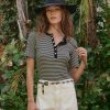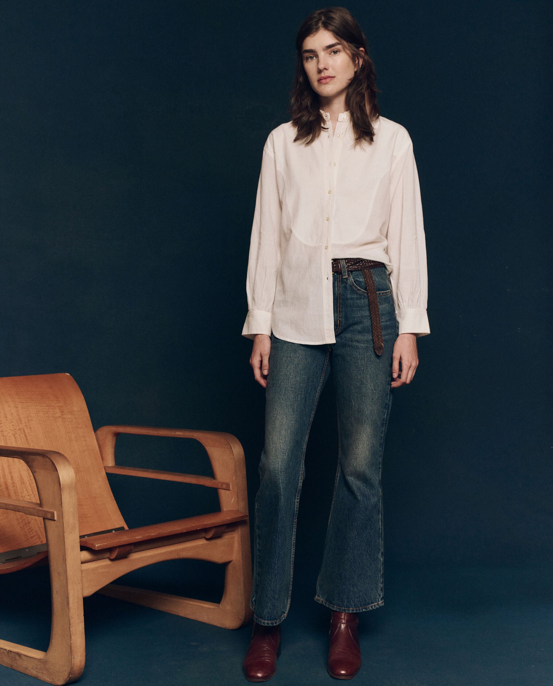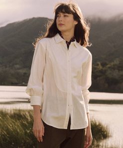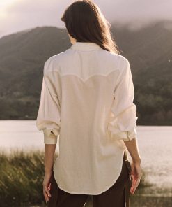 Taking notes from a soft and slouchy 1950s menswear button-up, The Cowboy Tux Top features airy, rumpled cotton with a striped texture. Western-style yokes and double-needle topstitching add vintage charm. Tall cuffs with pleating and a longer shirttail length provide the perfect finishing touches to this classic style.