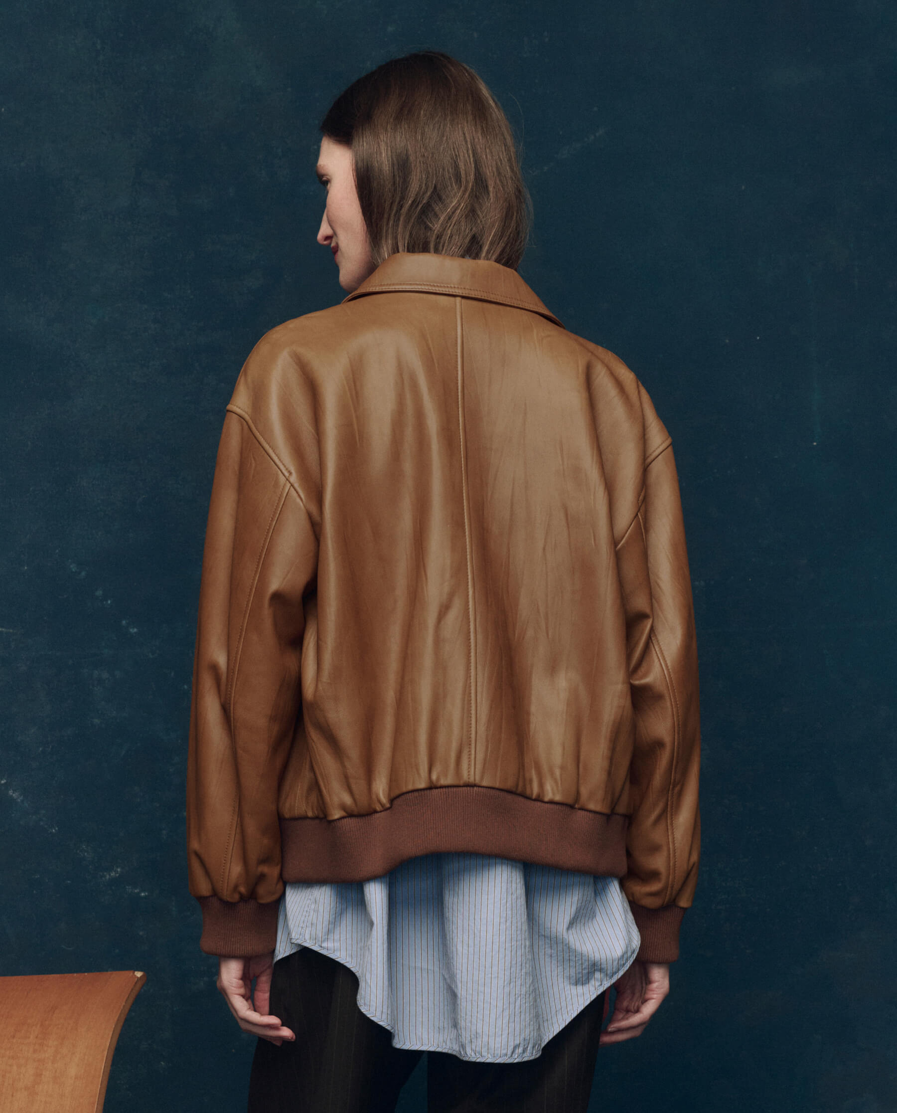 A reimagining of a timeless classic, The Flight Jacket draws inspiration from the utilitarian outerwear worn by WWI pilots in the early 1900s. Designed with intention and a sense of story, this jacket balances heritage details with a modern, lived-in feel. Crafted in a softly structured silhouette, it features a slouchy fit with dropped shoulders and a boxy shape that layers effortlessly. Patch pockets with metal snaps offer function with a hint of rugged charm, while a wide collar, front zip closure, and snug ribbed cuffs and waistband nod to its vintage roots. Inside, a peach satin lining adds a playful contrast—like the unexpected pop of a cherished heirloom passed down with love. Wear it over feminine dresses or your favorite worn-in jeans—it’s made to be styled your way.
