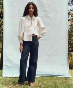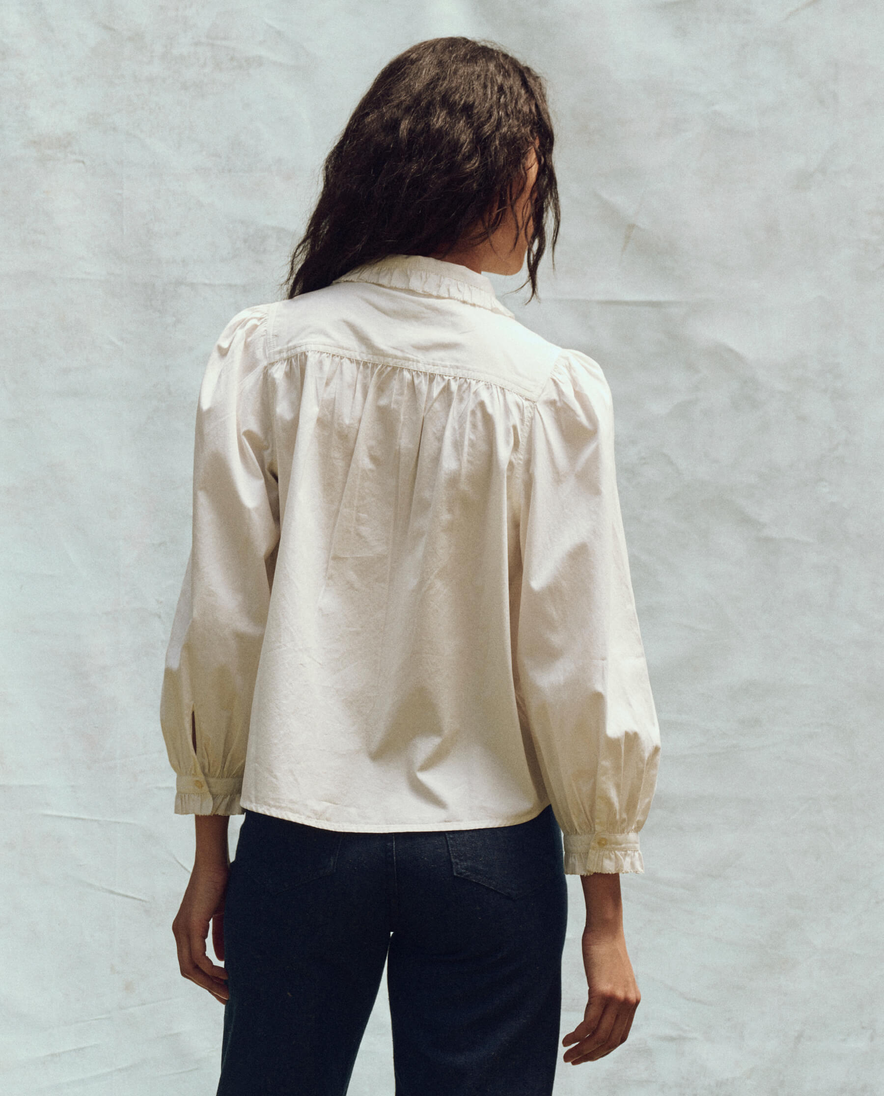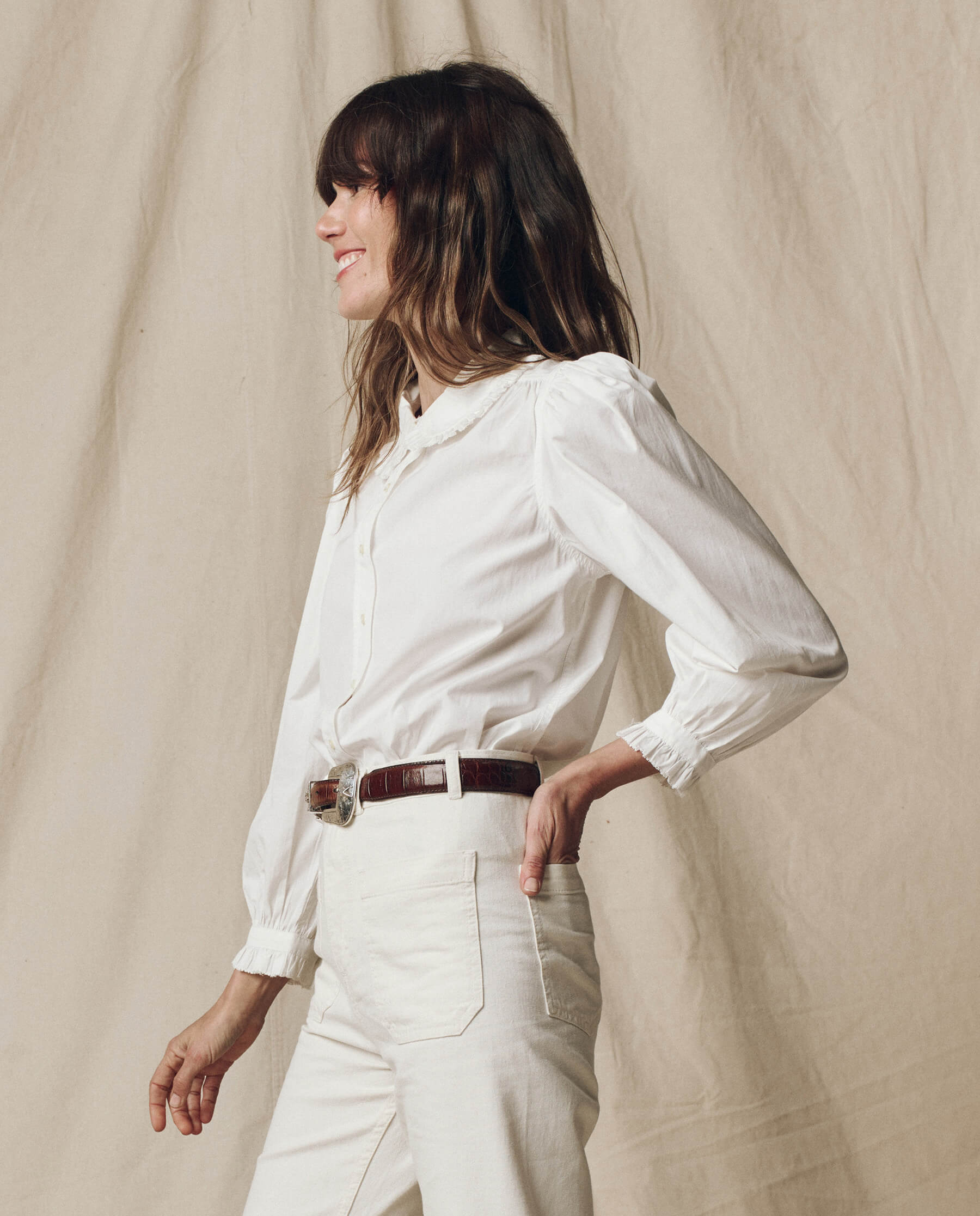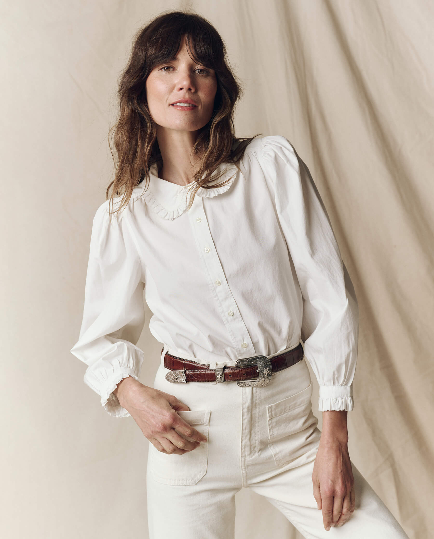 A sweet take on a vintage find, The Hemingway Top. features ruffle details on its wrist cuffs and on its oversized, round collar that’s designed to be worn closed to the high neck or open and relaxed. Its shoulders are inset with shirring and pleats to add volume, and it’s cropped to hit at the high waist so that it tucks easily.