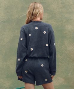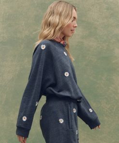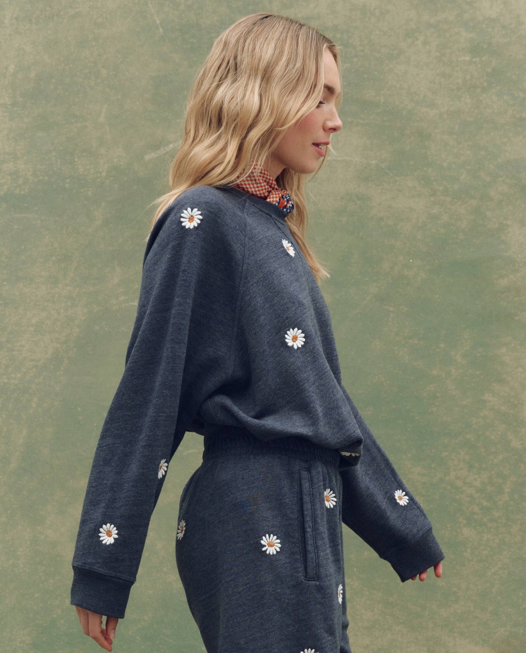 The Slouch Sweatshirt. is inspired by a treasured vintage find. This wear-with-everything piece has extra slouch, a straight shape, and fuller sleeves than The College Sweatshirt. Cut from a washed tri-blend terry fabric with a vintage inspired heathered look. Made locally in Los Angeles with a special embroidered floating daisy technique, our process ensures beauty and uniqueness—no two pieces are alike.