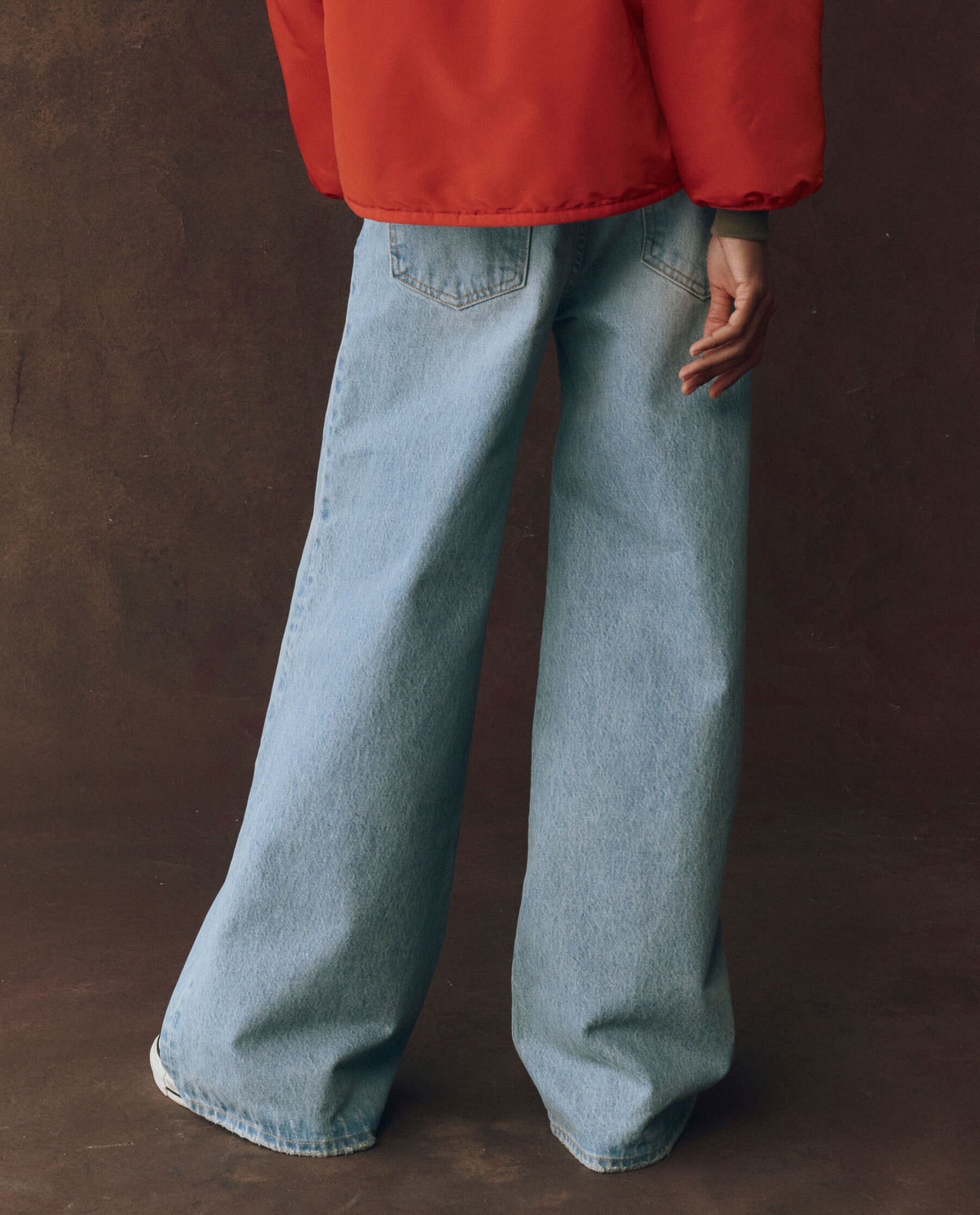 The Slouch Wide Leg Jean sits low on the hips with a long inseam and a wide, easy leg. Classic five-pocket construction includes scoop pockets, back