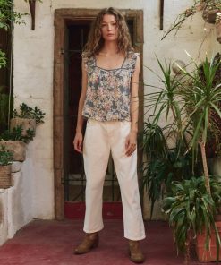 This top features pintuck and pleat detailing at the front and back neckline and shoulders, creating a refined, textured look. The flowy silhouette is crafted from lightweight, textured cotton slub, adorned with Pre Fall’s Indigo Floral Print. It has a square neckline trimmed with delicate cotton lace, a front button placket with shirting buttons, and scooped armholes with ruffle edges and a picot finish for added charm.