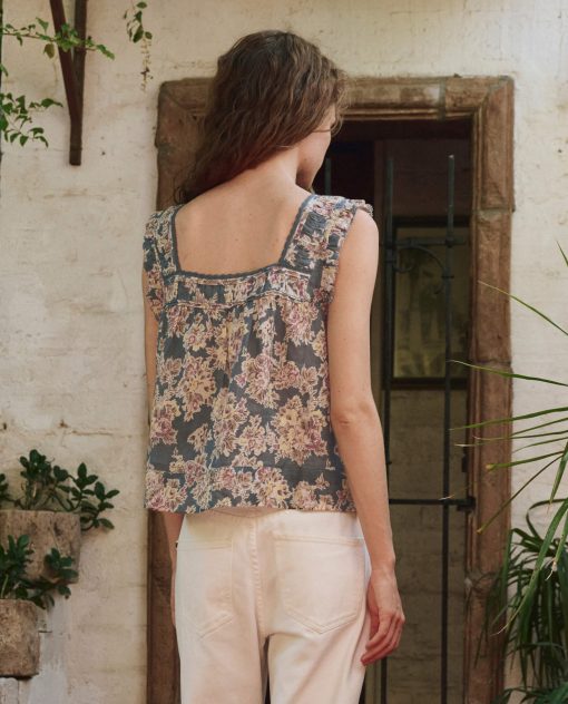 This top features pintuck and pleat detailing at the front and back neckline and shoulders, creating a refined, textured look. The flowy silhouette is crafted from lightweight, textured cotton slub, adorned with Pre Fall’s Indigo Floral Print. It has a square neckline trimmed with delicate cotton lace, a front button placket with shirting buttons, and scooped armholes with ruffle edges and a picot finish for added charm.