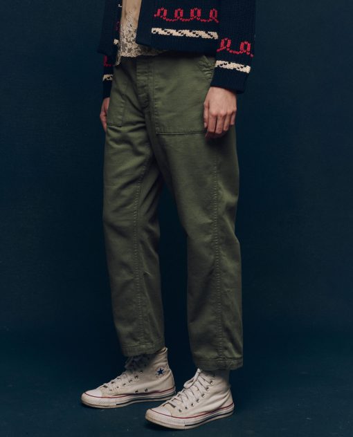Inspired by classic military styles, this piece is made in LA from washed-down cotton sateen fabric. It has a slouchy fit that sits low on the hips with a wide, straight leg. Vintage details include a longer fly, patch pockets, corozo buttons, and double-needle stitching.