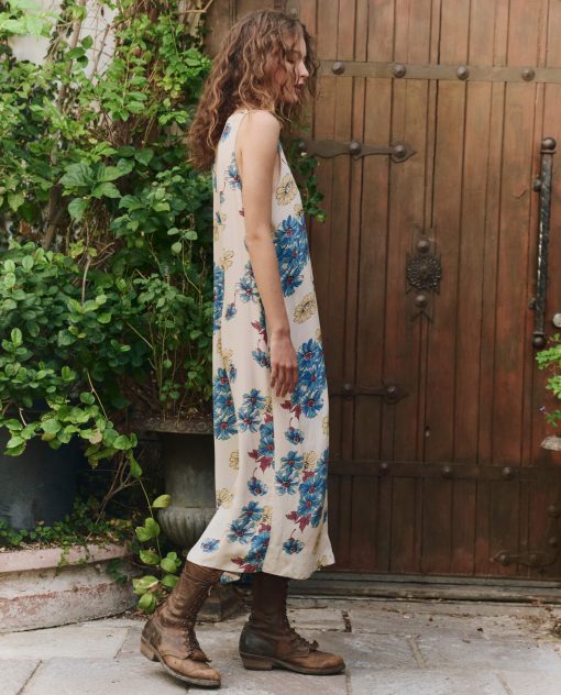 A timeless warm-weather essential, The Windward Dress is a loose-fitting tank slip dress with a relaxed column shape that drapes effortlessly away from the body. Featuring a scooped neckline and deep armholes, its picot-edged finish adds a subtle, delicate touch. Unexpected hip darts create a soft, flattering shape, while a wide, turned-back hem gives the piece just the right amount of structure. Made from matte viscose in this season’s Sungold Floral, a dreamy pattern of rich blues and yellows, this dress is the perfect pairing for vintage denim and sun-kissed days.