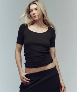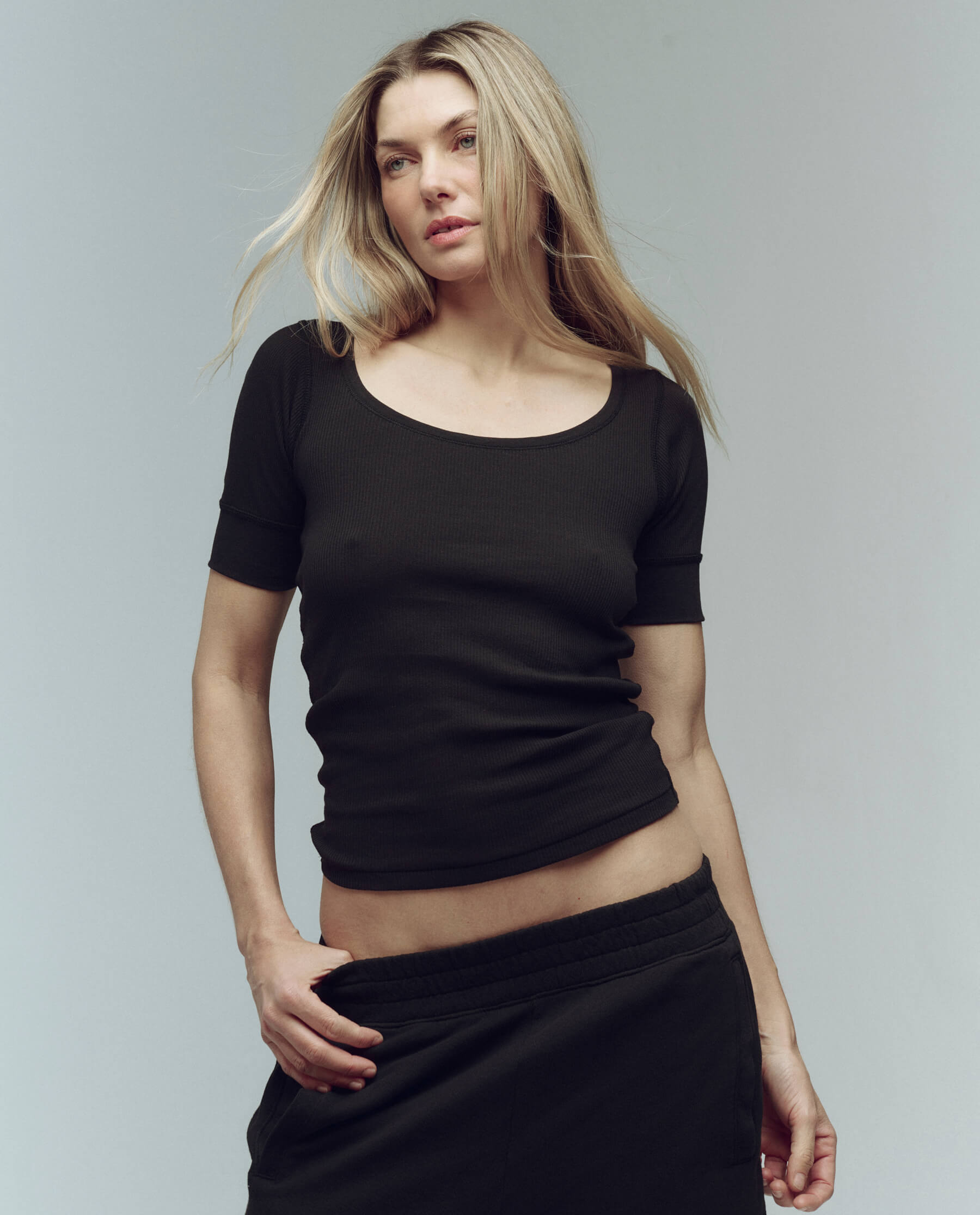 The Baby Rib Ballet Tee is a fresh take on vintage 1930s cotton undershirts, reimagined with a feminine edge. It features a scooped neckline with delicate binding, set-in short sleeves, and a wide, fine rib that adds structure and softness. Made from lightweight baby rib with a close-to-body fit and just the right amount of stretch, it’s as comfortable as it is timeless. Handcrafted in Los Angeles, ensuring no two pieces are exactly alike.