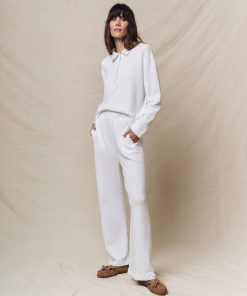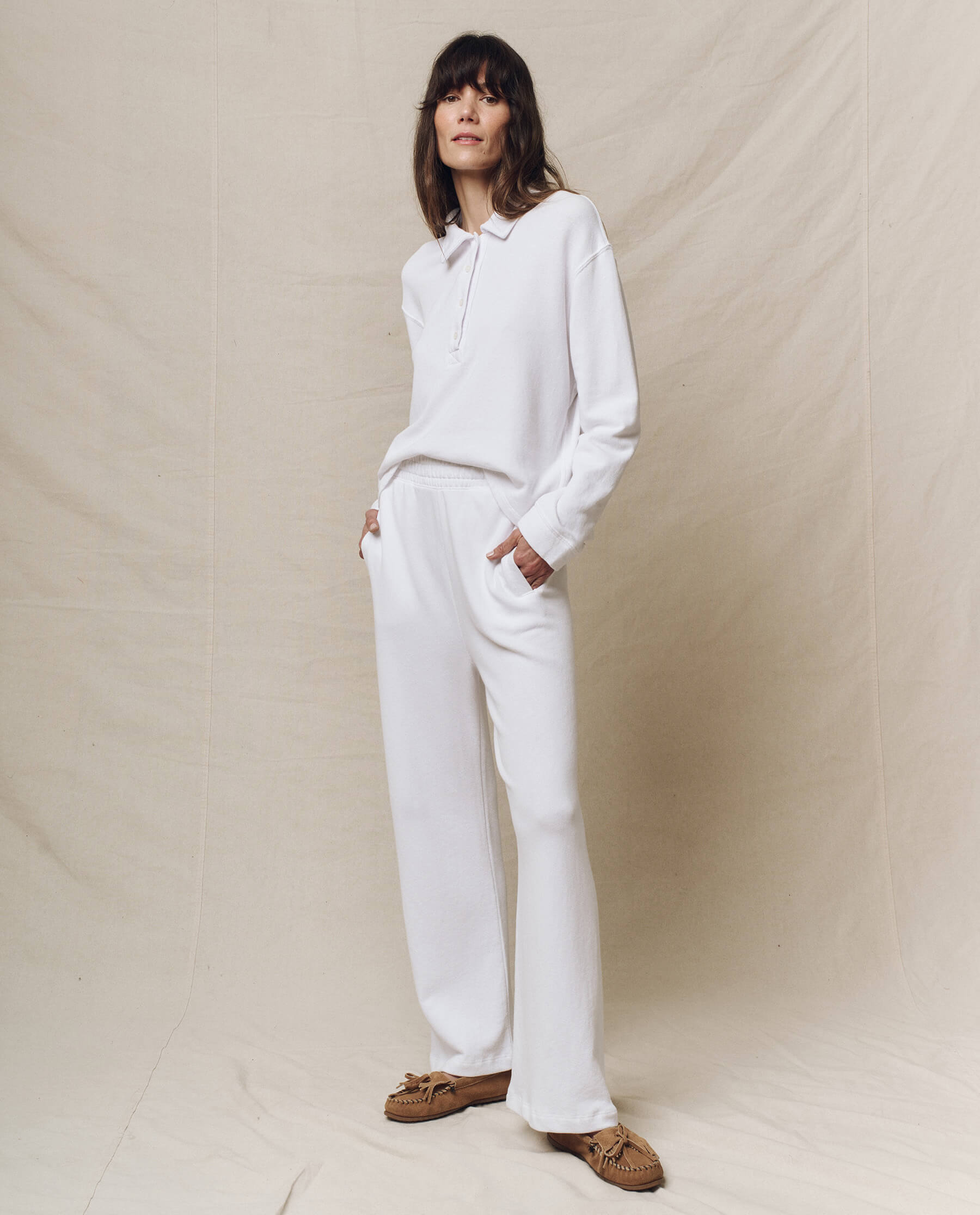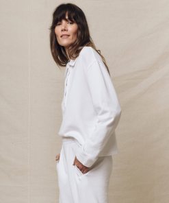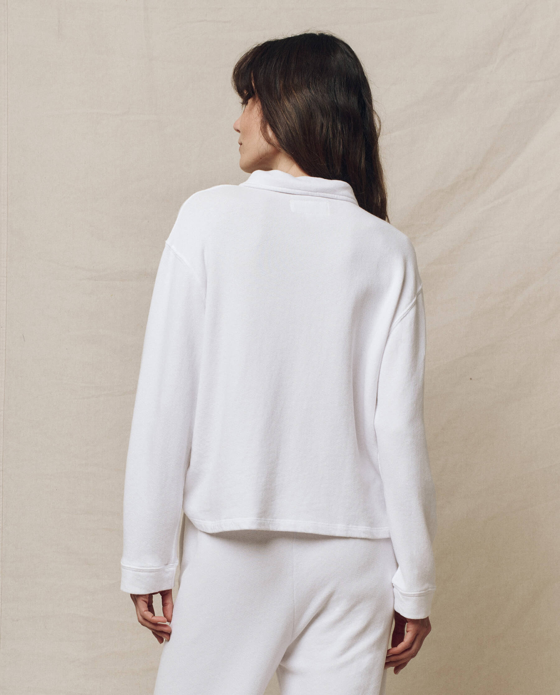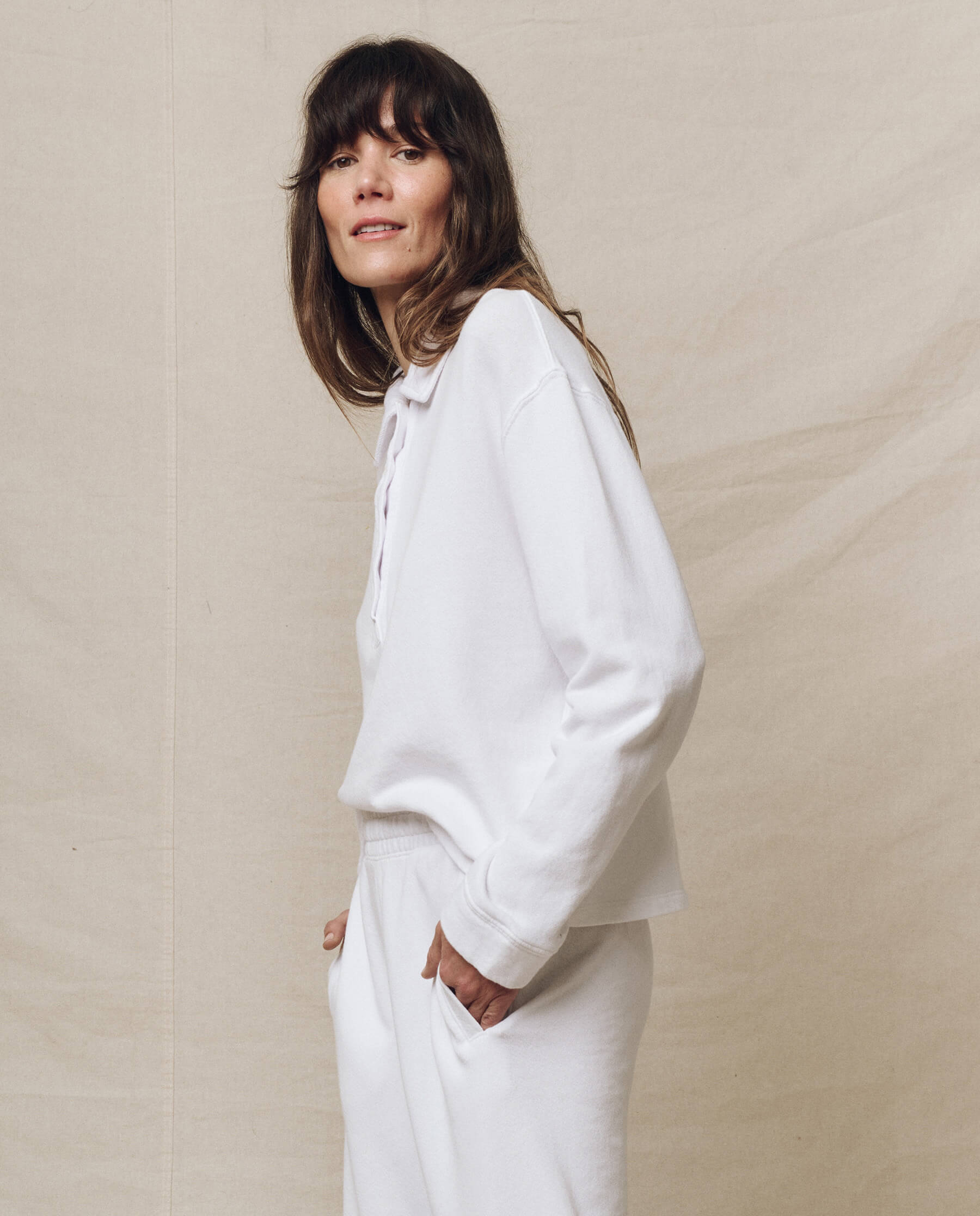 This boxy, straight-fitting top features a clean turnback hem, slightly dropped shoulders, and straight sleeves with a self-cuff for a put-together, cozy feel. A classic placket with natural shirting buttons and a self polo collar adds timeless detail. Pair with The Victory Sweatpant for an effortless look. Our knits are crafted here in L.A., ensuring beauty and uniqueness in that no two pieces are alike.